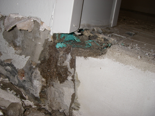 Pesuhuone vuotaa väliseinän sisälle puutteellisten vedeneristyksien vuoksi | |